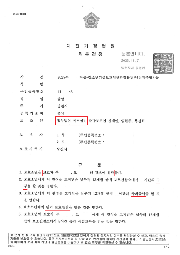 재판장님께서는 비록 강제추행이 인정되지 않는다고 하더라도 그 과정이 매우 불량하며, 특히 촬영물을 '뿌리겠다'고 협박한 것은 매우 엄중한 사안임을 엄하게 꾸짖으시면서도, 보조인의 변론과 보호자의 계도의지를 마지막으로 믿어보겠다고 하시며, 의뢰인 자녀에 대하여 소년분류심사원 위탁 없이 1호, 2호, 3호, 4호 처분만을 내려 주셨습니다(보호자 감호위탁, 수강명령, 사회봉사, 단기 보호관찰).