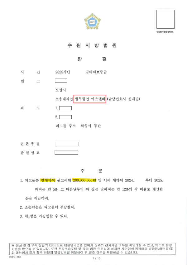 법원은 법무법인 SLB 소송대리인단의 주장을 받아들여, 원고 전부승소 판결을 선고하시어 판결은 그대로 확정되었습니다.