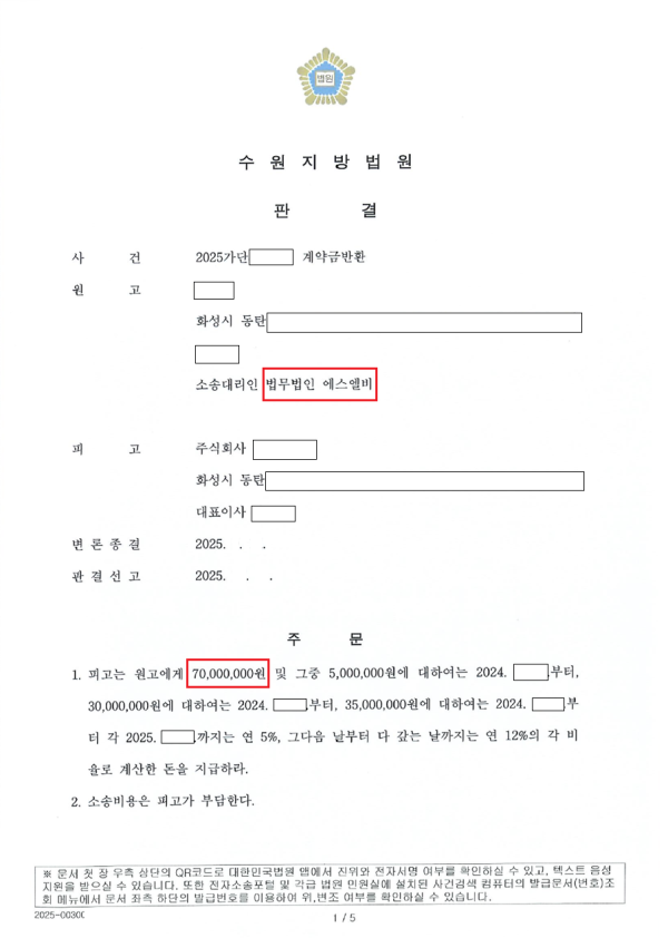 법원은 법무법인 SLB의 주장을 받아 주시어, 7,000만원의 계약금 전액의 반환은 물론, 청구취지대로 계약금의 분할 지급일을 기준으로 지연손해금 지급까지 명하는 원고 전부승소 판결을 선고하셨습니다.