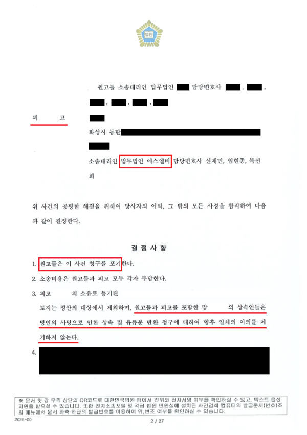 법원은 당사자 협의 결과에 따라 원고들이 유류분반환청구를 모두 포기하되 소송비용은 각자 부담하고, 법무법인 에스엘비가 의뢰인에 대한 사전증여가 아닌 것으로 주장한 의뢰인 소유의 토지에 대하여는 이를 원고들이 인정하되, 기타 일부 사전증여된 재산에 대하여는 일부 정산을 마치는 방향으로 화해권고결정을 내려주셨습니다.