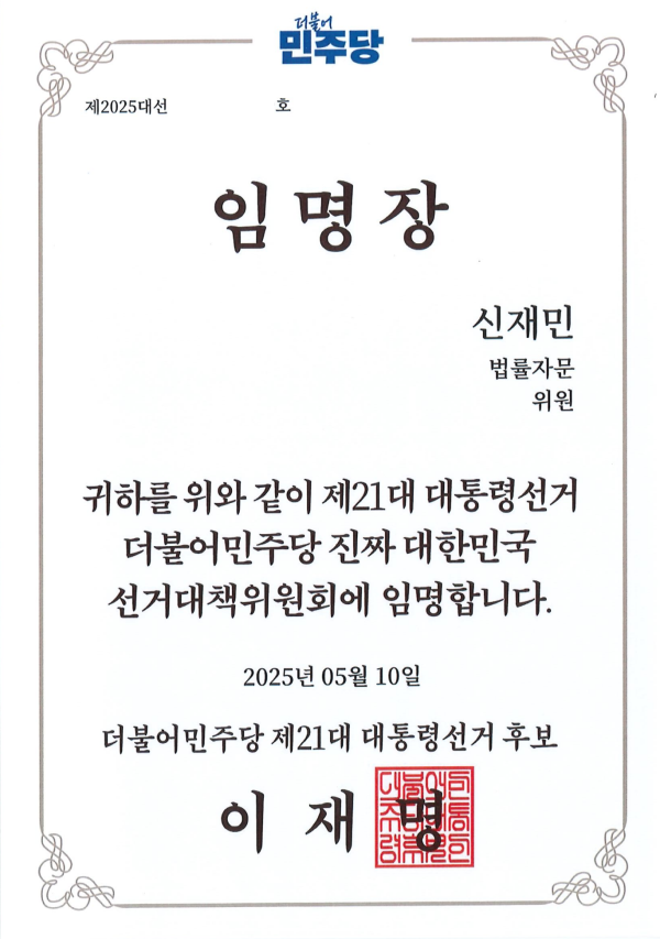 신재민 변호사, 이재명 대통령 후보 선거대책위원회 법률자문위원 위촉 페이지 정보 법무법인SLB 작성일25-07-18 목록 본문 법무법인 SLB 신재민 변호사가 더불어민주당 선거대책위원회 법률자문위원에 임명되었기에 알려드립니다. 목록