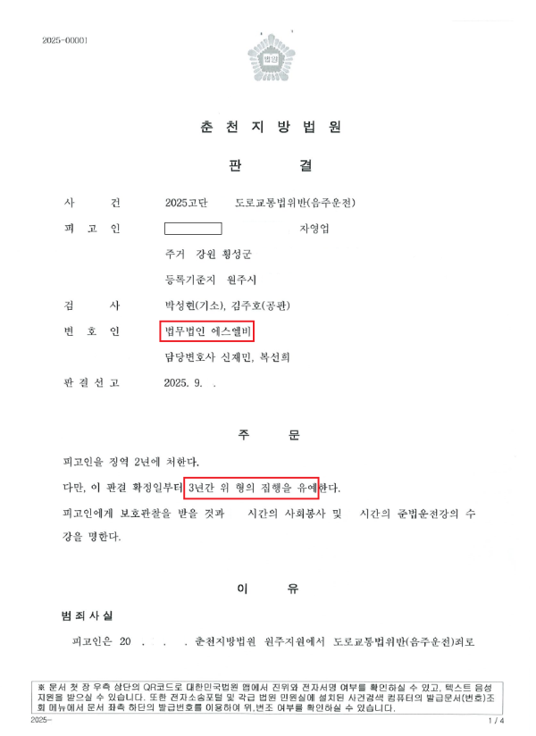 의뢰인께서는 음주운전 4회째로 10년 내 집행유예 전과가 있으셨기에 이른바 '윤창호법'의 적용을 받는 상황이셨는데, 그럼에도 매우 높은 혈중알코올농도의 주취 상태에서, 그것도 고속도로를 주행하셨기에, 실형 선고의 가능성이 매우 높은 상황이었습니다. 그러나 법무법인 SLB는 진심을 담은 변론으로 집행유예 판결을 이끌어 냈습니다. 재판장님께서도 판결을 선고하시며 이례적으로 변호인의 의견서의 내용과, 변호인이 수집하여 제출한 양형자료의 유효성을 언급하여 주시기도 하였습니다.
