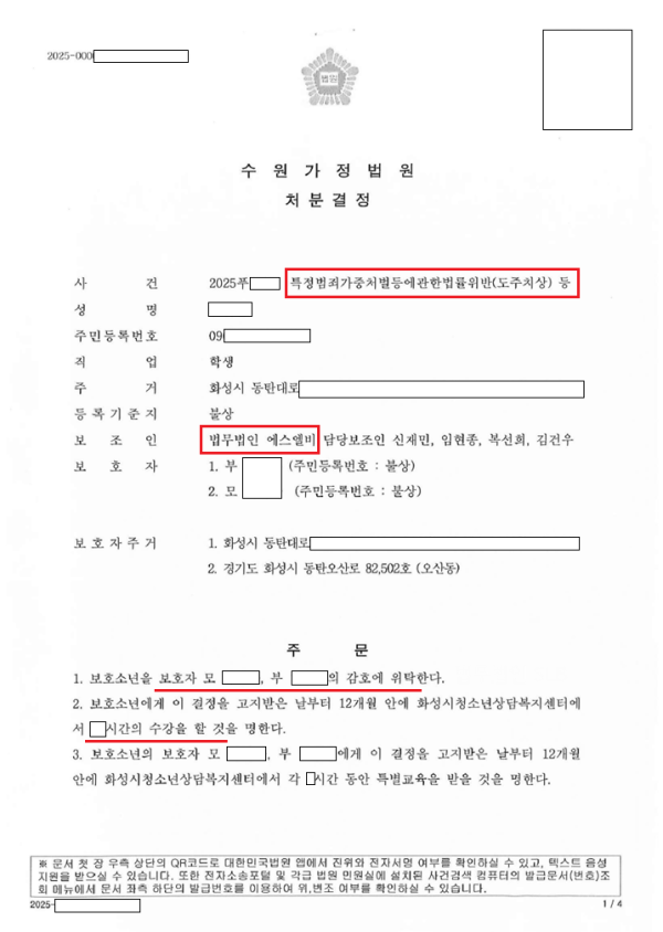 재판장님께서는 소년재판에서 의뢰인 자녀를 엄히 꾸짖으시면서도, 사건 경위에 관한 설명과 보호자의 계도의지를 신뢰하여 주시어 의뢰인 자녀에 대하여 1호, 2호 처분만을 내리며 선처하여 주셨습니다(보호자 감호위탁, 수강명령).