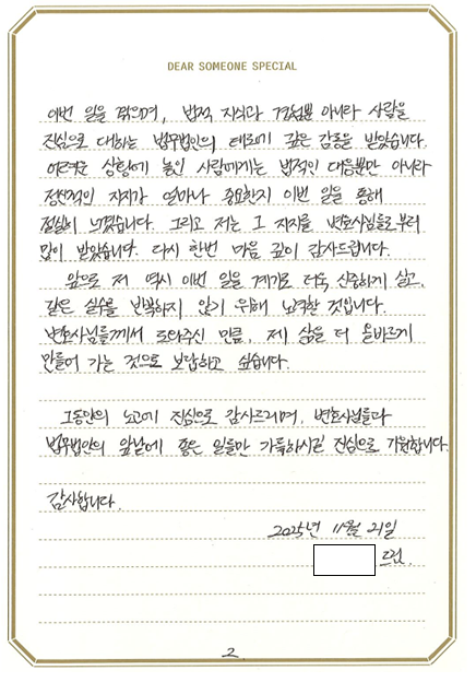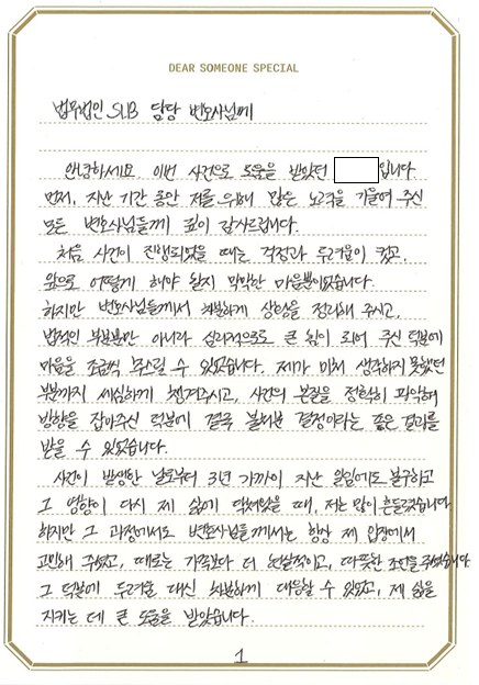 변호사님들께서 도와주신 만큼, 제 삶을 더 올바르게 만들어 가는 것으로 보답하고 싶습니다.